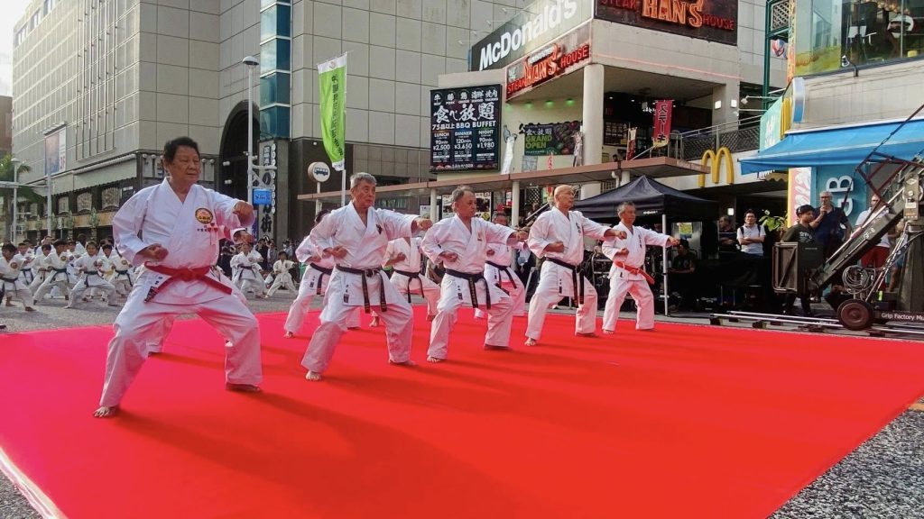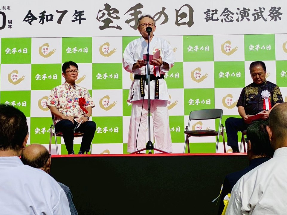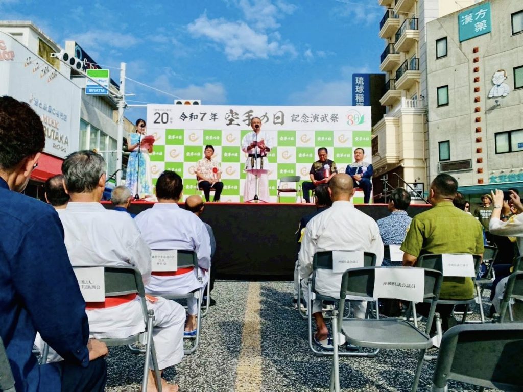 2025/11/06 令和7年空手の日記念演武祭in国際通り 10月25日は『空手の日』 10月26日『令和7年空手の日記念演武祭』では挨拶のほか、国際通りに集結した老若男女3,000人余りの空手愛好家皆様と『普及型1、2、3』の一斉演武、三戦演武、参加者全員による『平和を祈る50本突き』などを行いました。 気合いの声がこだまする国際通りの大勢の演武参加者に感激して、沖縄空手のさらなる普及発信と、自らも精進への気持ちを新たにしたそうです。