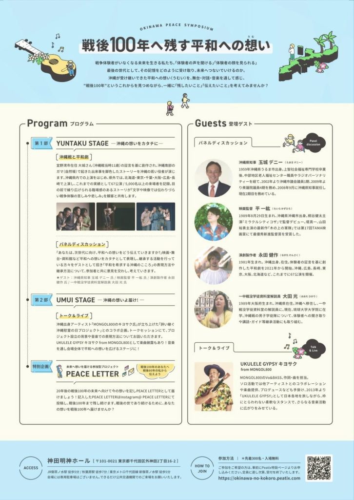 沖縄戦、終戦から80年。 戦争体験者がいなくなる未来を生きる私たち。「体験者の声を聞ける」「体験者の顔を見られる」最後の世代として、その記憶をどのように受け取り、未来へつないでいけるのか。沖縄が受け継いできた平和への想い(うむい)を、舞台・対話・音楽を通して感じ、”戦後10年”というこれからを見つめながら、一緒に「残したいこと」「伝えたいこと」を考えてみませんか?