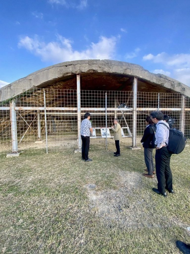 旧日本軍が戦闘機を隠す目的で作られた「掩体壕(えんたいごう)跡(読谷村)」は、唯一残っている一基が村によって文化財指定され良好な状態で保存されていることを確認しました。