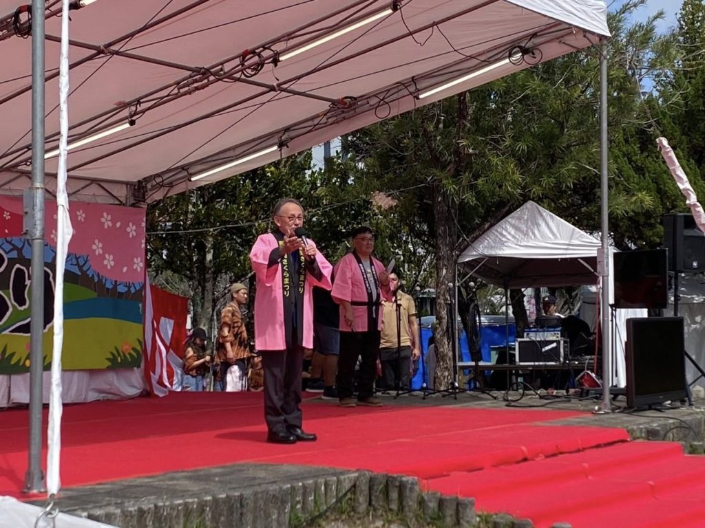 桜色のハッピをお借りして玉城デニーもステージにて皆様へご挨拶をさせていただきました。